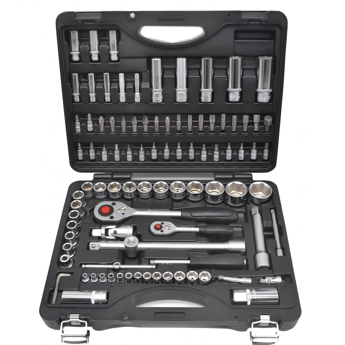 The set includes standard and deep sockets, ratchets, extensions, universal joints and a wide range of HEX, Torx, Philips and Pozidriv bits. It is suitable for automotive repair, construction machinery service and industrial maintenance, offering reliability and durability for demanding workshop applications.
